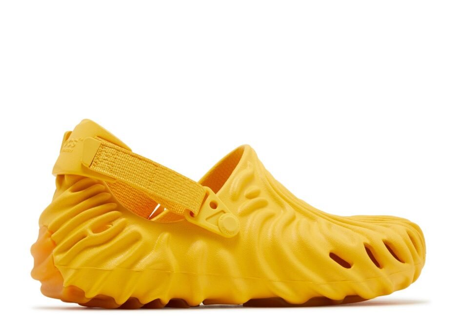 De Salehe Bembury x Crocs Pollex Clog ‘Yolk’ heeft een getint geel bovenwerk van gegoten schuim en een vingerafdruk-geïnspireerd ontwerp, gevormd door wervelende, concave ribbels. Deze instappers hebben een verstelbare hielband voor een goede pasvorm, terwijl ventilatieopeningen op de hiel en voorvoet het ademend vermogen bevorderen. Bembury’s kenmerkende vingerafdrukontwerp is gemonogrammeerd op de buitenzool, versterkt met rubberen noppen voor soepele grip.